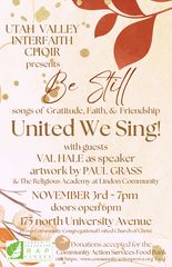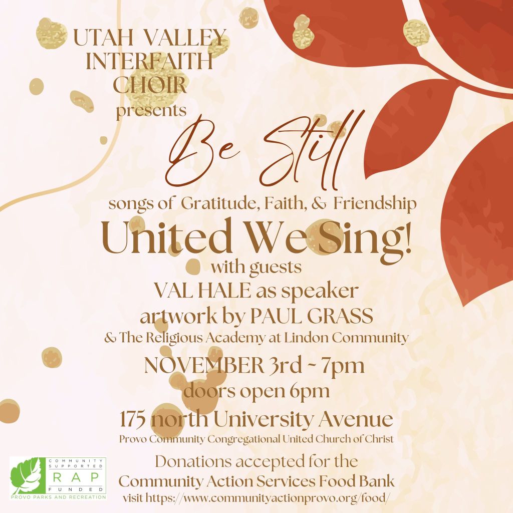 United We Sing! is an annual evening of inspirational music, message, and art provided by Utah Valley Interfaith Choir and their invited guests. Val Hale will be the guest speaker and Paul Grass and students from the Religious Academy at Lindon Community will be showcasing their artwork. We will also be accepting donations for the Community Action Services Food Bank. You don’t want to miss it!