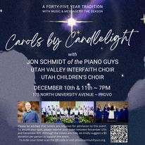 The Provo Community Congregational United Church of Christ is excited to announce that Jon Schmidt of the Piano Guys will headline this year’s 45th Annual Carols by Candlelight for two nights, Sunday, December 10th, and Monday, December 11th. The annual event will also feature music by the Utah Valley Interfaith Choir and Utah Children’s Choir and will pay homage to the event founders, the late Monroe and Shirley Paxman and their family on this anniversary year.