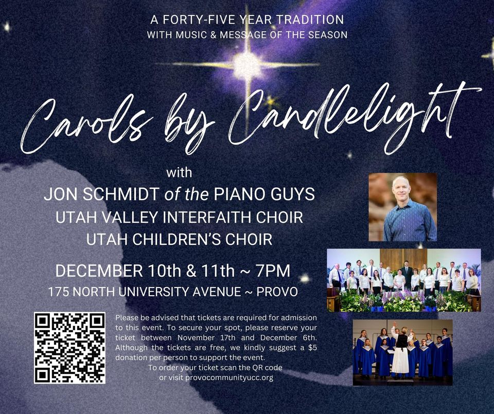 The beautiful celebration of the birth of Christ will be held at the historic Provo church’s newly refurbished sanctuary, located at 175 North University Avenue. Doors open at 6:30 p.m. with the event starting at 7pm. Due to the popularity of the event, tickets will be required this year and can be reserved at by visiting http://provocommunityucc.org/7139-2/ November 17, 2023 through December 6, 2023. Tickets are free with a $5.00 suggested donation per person.