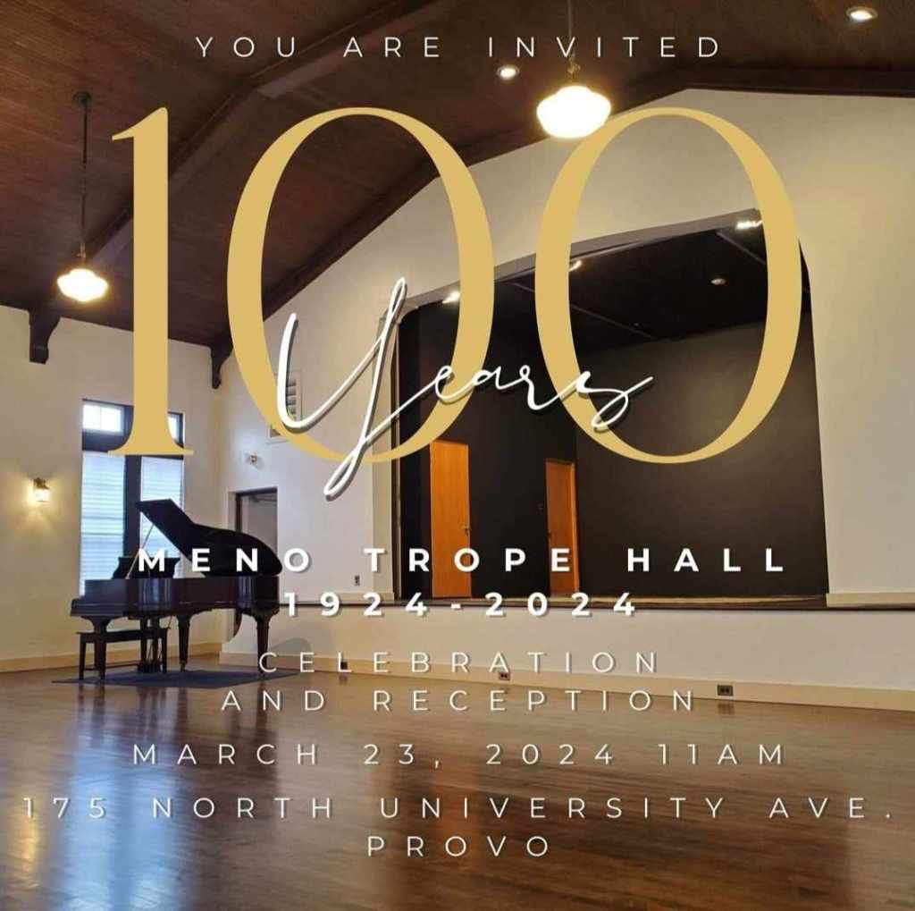 Celebrate with us the great heritage Meno Trope Hall at the Provo Community Church is with stories from the past and the bright future ahead. Guest speakers will be from the State of Utah, Preservation Utah, local leaders, music by Utah Valley Children’s Choir, Flag Ceremony by Troops 37 and 51, and a special visitor from the past. Refreshments, reception, and tours to follow!